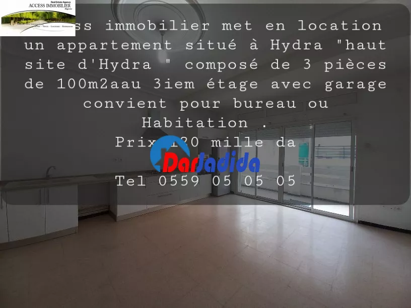 Access immobilier met en location un appartement situé à Hydra "haut site d'Hydra " composé de 3 pièces de 100m2aau 3iem étage avec garage convient pour bureau ou Habitation .