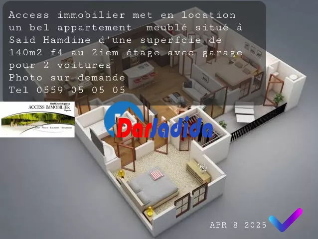 Access immobilier met en location un bel appartement meublé situé à Said Hamdine d'une superfcie de 140m2 f4 au 2iem étage avec garage pour 2 voitures